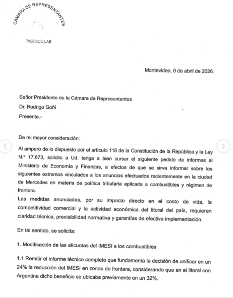 📍 Presentamos un pedido de informes al Ministerio de Economía y Finanzas por los cambios en el IMESI a los combustibles en zonas de frontera