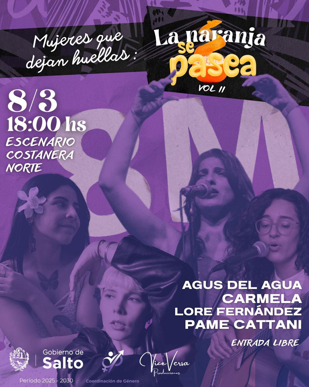 En el marco del Día Internacional de las Mujeres, la Coordinación de Género, en conjunto con Vice Versa Producciones, invita a la ciudadanía a participar de la actividad “Mujeres que dejan huellas: La naranja se pasea Vol. II”. El evento tendrá lugar este domingo 8 de marzo, a partir de las 18:00 horas, en el escenario de la Costanera Norte.