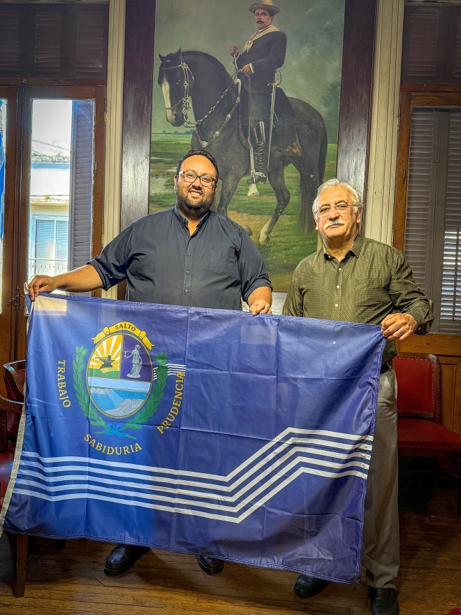 El Presidente de la Junta Departamental de Salto, Dr. Enzo Molina Franchini, hizo entrega de la bandera de Salto al Prof. Silvio Previale, quien partirá a Europa en una gira con otros Acordeonistas, que incluirá varios destinos representando una vez mas al Departamento.