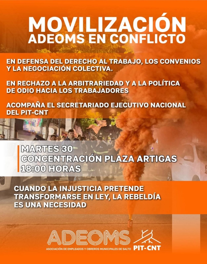 Somos casi 300 trabajadores que fuimos cesados de nuestros trabajos en Intendencia de Salto, de manera despótica, autoritaria, injusta e ilegítima. Donde al interrumpir nuestra permanencia se desconocen instituciones, leyes, decretos departamentales, convenios colectivos y derechos nacionales e internacionales reconocidos a trabajadores que costaron un enorme sacrificio de la clase obrera poder adquirirlos. Somos funcionarios con 2, 4, 5 y hasta 10 años cumpliendo tareas permanentes en intendencia de Salto, que habíamos ingresado por designación directa y con contratos a términos , pero que luego de mucho trabajo de nuestro gremio y amparados por un marco legal favorable fuimos partícipes de un conjunto de acciones que comenzaron a principios de 2024 y que culminaron con el convenio colectivo del 25 de Junio de 2025, por el cual cambiamos nuestra calidad de temporales a permanentes. Convenio firmado por ADEOMS e Intendencia de Salto frente a Ministerio de Trabajo, quien acompañó todo el proceso, y en un marco legal avalado por el artículo 38 del decreto departamental 7327/2021 – actual presupuesto departamental – el cual fue votado por unanimidad de la Junta Departamental de Salto, donde se otorga a los convenios colectivos fuerza de ley departamental. A todo esto podemos agregar que por la fecha en que comenzaron las acciones que culminaron en nuestra permanencia, todo comenzó antes del año electoral y al ya ser funcionarios de años, ya estábamos previstos en el presupuesto y por ende no lo modificamos de manera negativa como se quiere hacer creer, es más, uno de los requisitos para adquirir la permanencia era renunciar al grado actual e ir a lo más bajo del escalafón, por lo cual gracias a este convenio la intendencia adquirió mano de obra especializada y al menor costo.