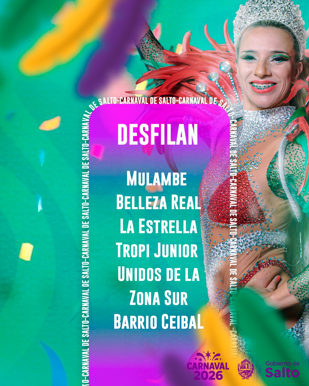 Con la participación de las escuelas de samba Mulambé, Tropi Junior, Belleza Real, Barrio Ceibal, La Estrella y Unidos de la Zona Sur, los conjuntos llegarán desde los distintos barrios de la ciudad con su fuerza y pasión para dejarlo todo.